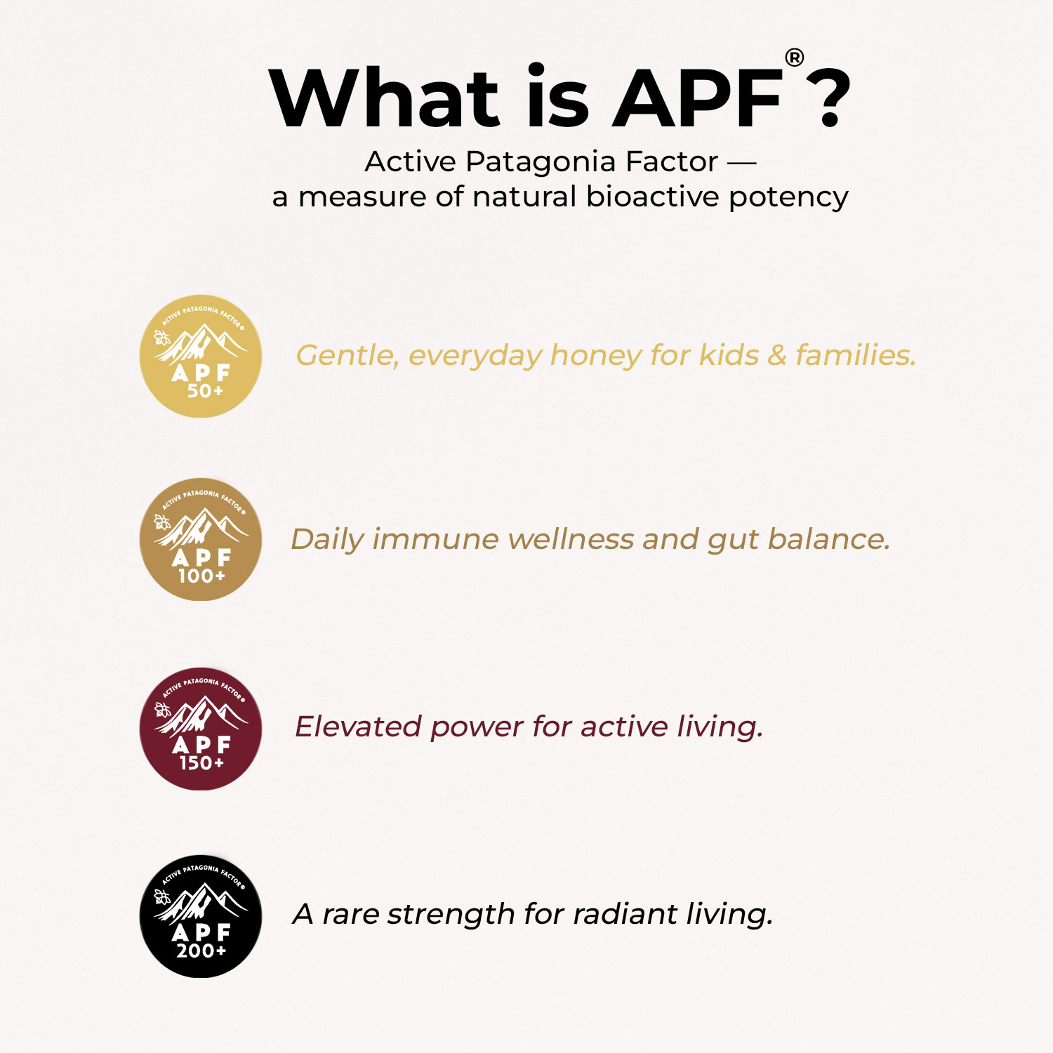 Our APF 150+ is a high-potency honey. Ideal to fuel energy and post-exercise recovery while supporting a balanced infammatory response and overall vitality.